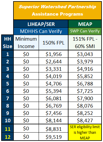 Households that are Low-Income Home Assistance Program (LIHEAP/SER) eligible or at or below 150% of the Federal Poverty Level (FPL) will also be eligible for Department of Energy Home Energy Scores or comprehensive assessments for the Michigan Home Energy Rebates (MiHER) program which can lead up to $34,000 in energy services. These programs are unique only to the Superior Watershed Partnership MEAP Grantee.